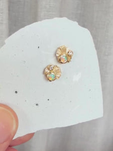 Petite, gold studs set with opals and diamonds. Two miniature structures of light.