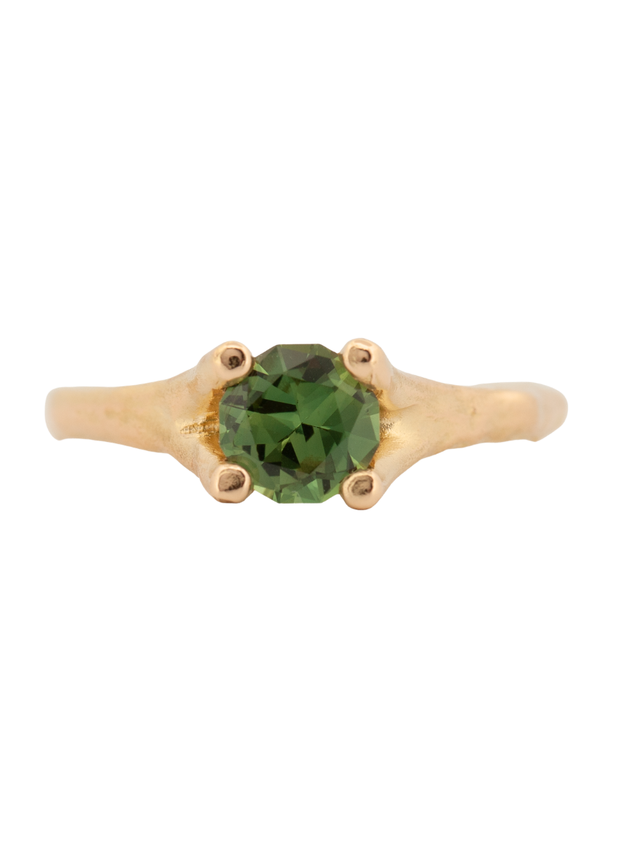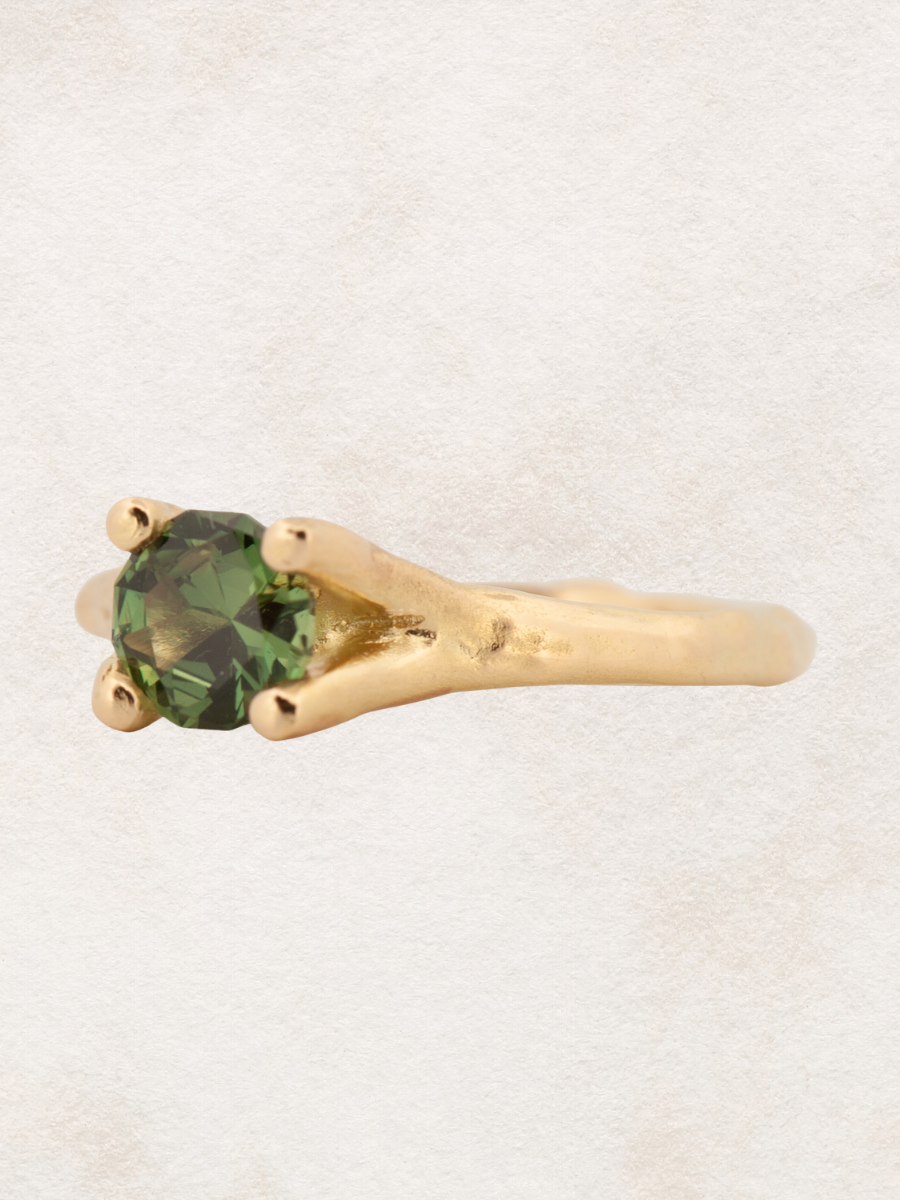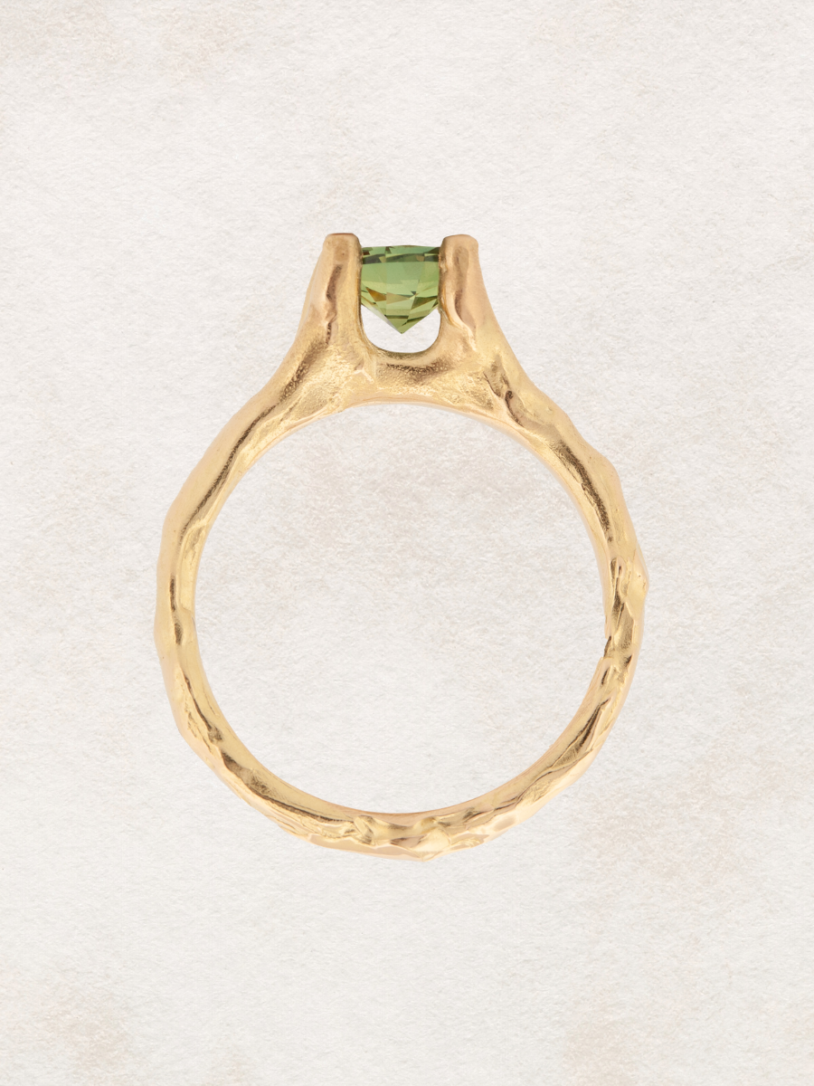 Dappled light through a forest canopy. The sapphire captured in a molten flow. An ancient and effortless form.